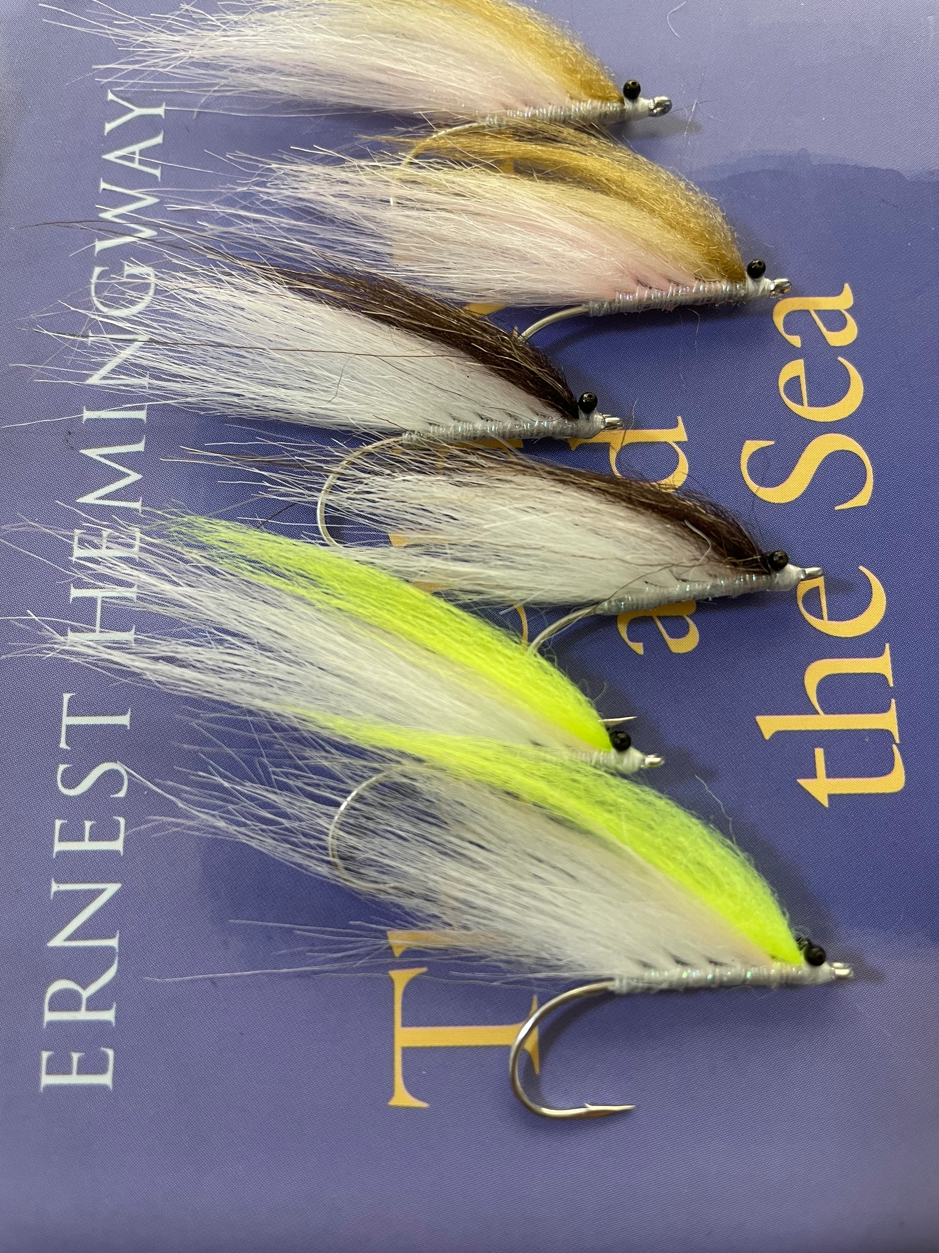 G社波止カマス鉤15号に巻いたストリーマーのセット。ウイングがフックに絡みにくい構造で、堤防から南の島のナブラ撃ちまでオールラウンドに使えるパターンです。