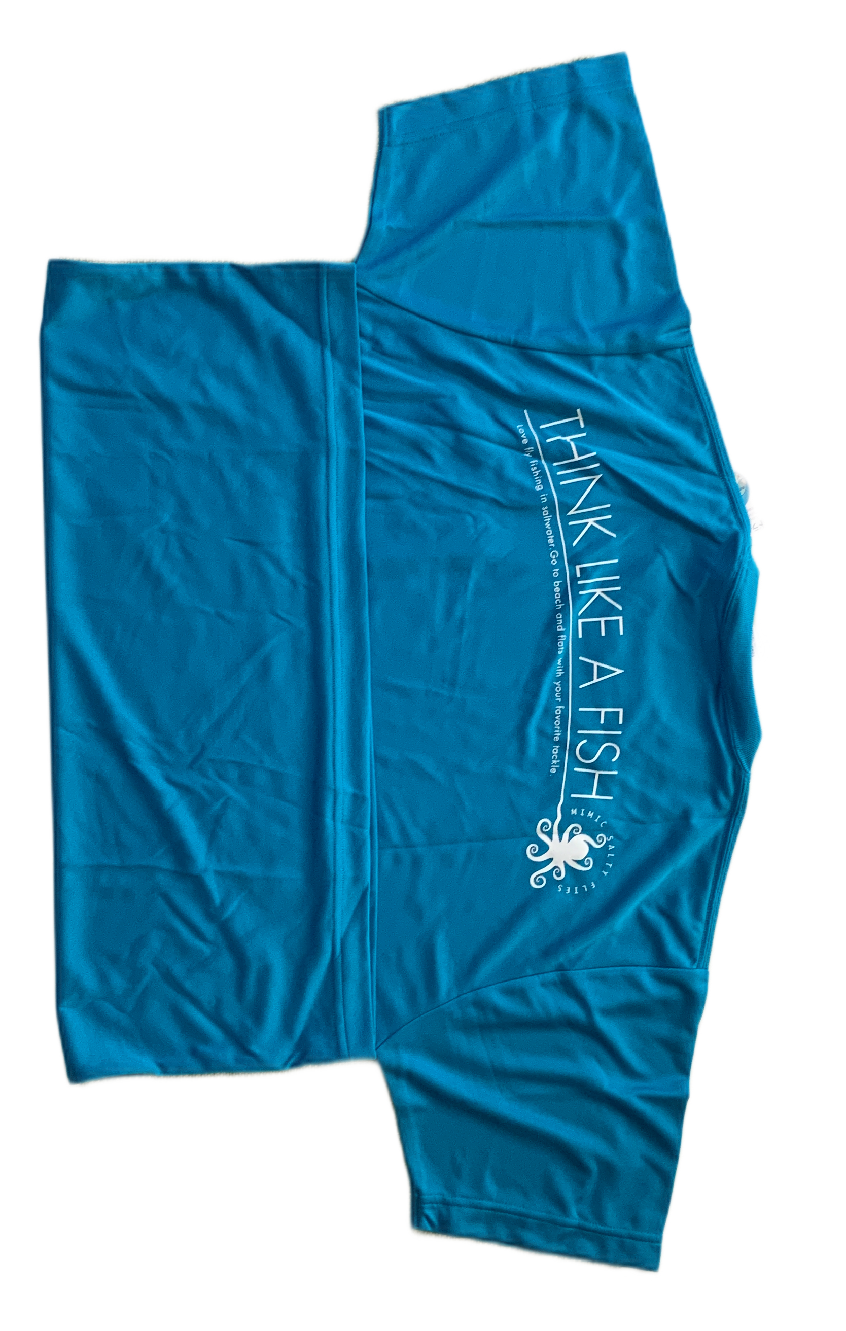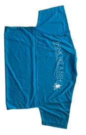 南の島で活躍する薄手の速乾生地にオリジ ナルデザインの半袖Tシャツです。魚を持って(手は濡らしてね)写真を撮ってもらうと魚からひと言のフキダシが一緒に写るというアイデア。バックプリント有り。シルクスクリーン印刷なので耐久性も抜群です。サイズはメンズのLです。限定1枚。