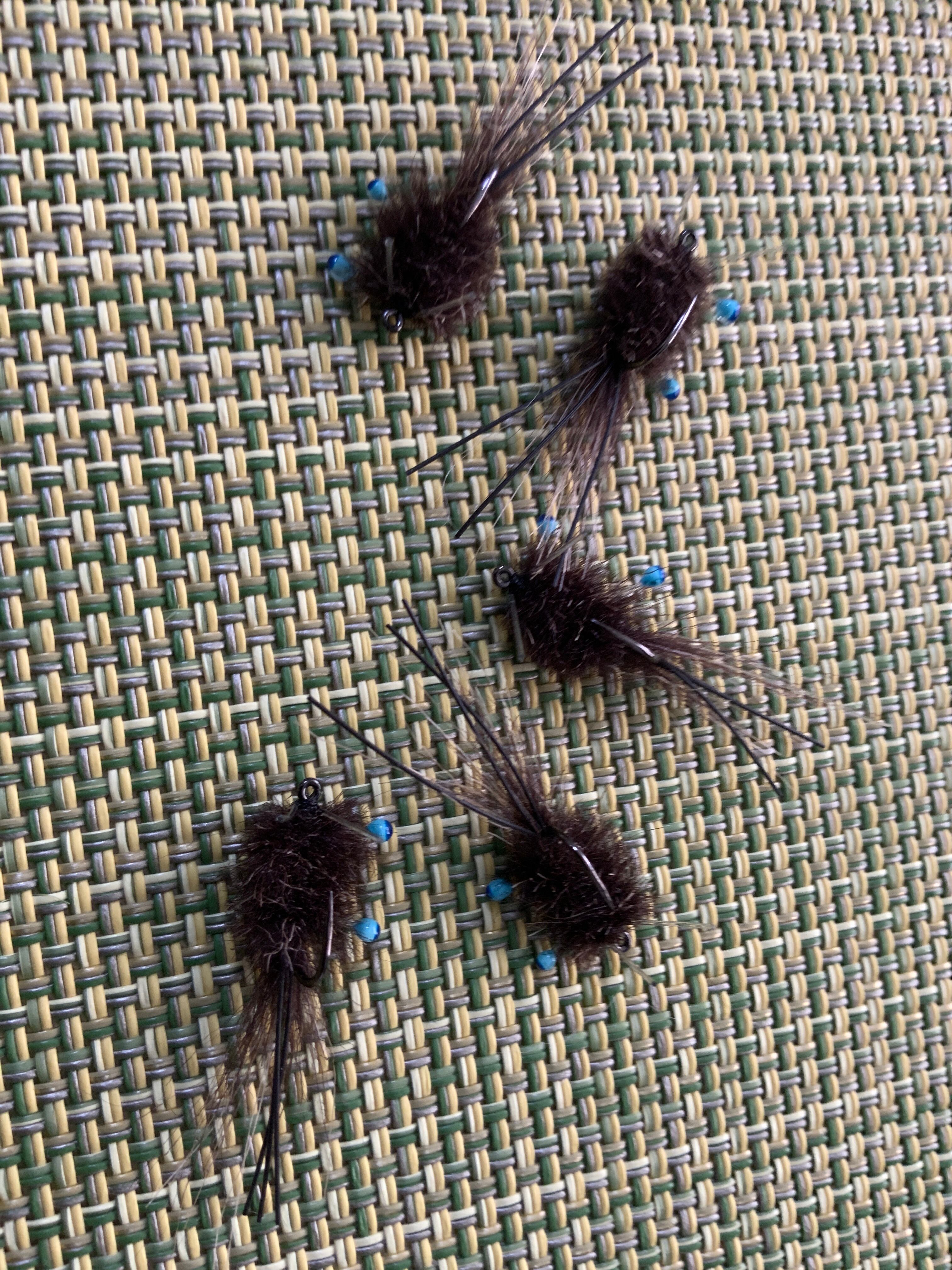管付きチヌ3号に巻いた小型のカニフライ。シャローでのテーリング撃ちに。ノンウエイトでガード付きなので砂利浜では必須パターンです。