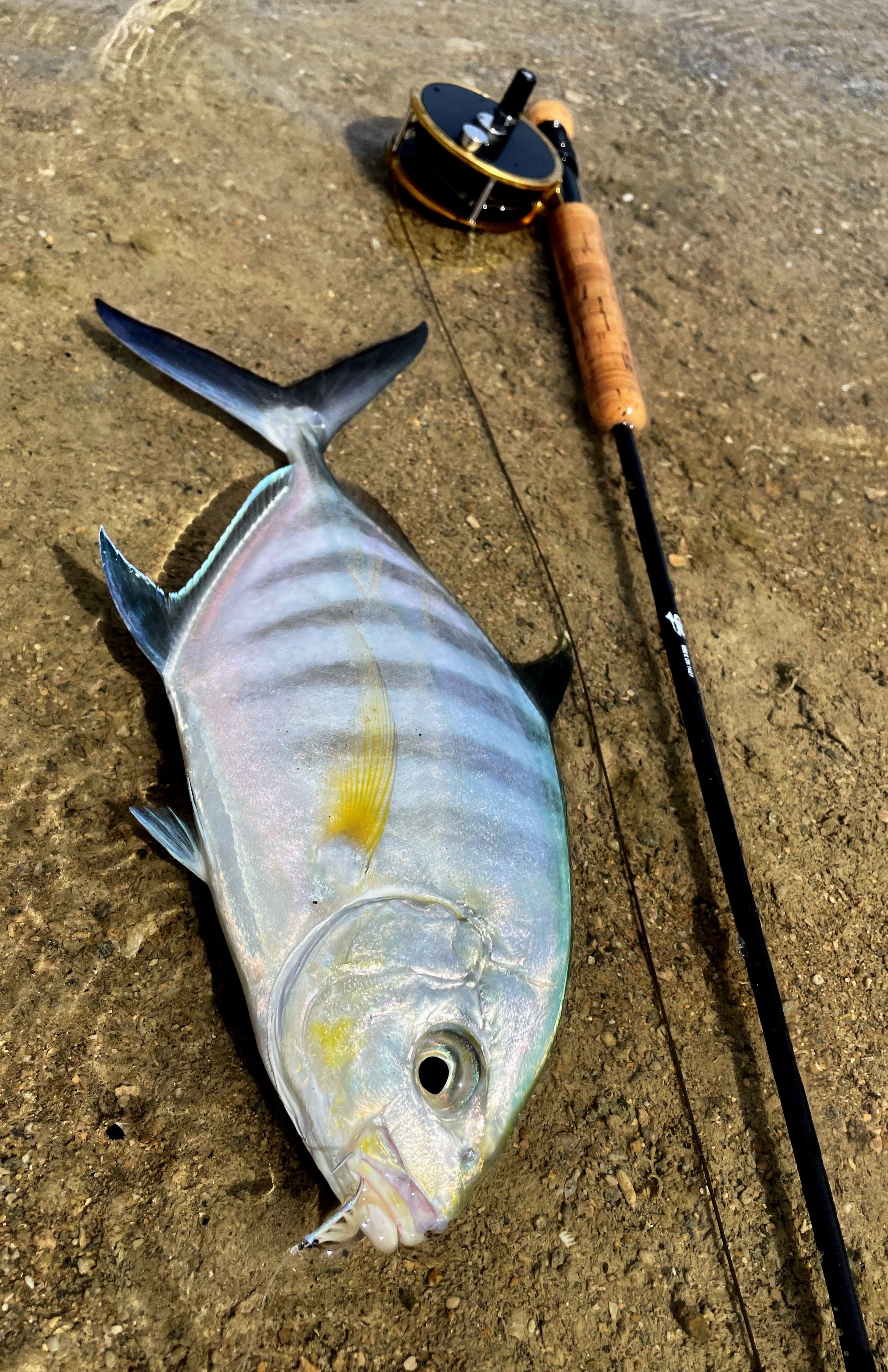 波止カマス14号に巻いたフォックスファーストリーマー。シャンク部はフラッシャブーを巻いてからコーティングしてあります。シラスナブラに。